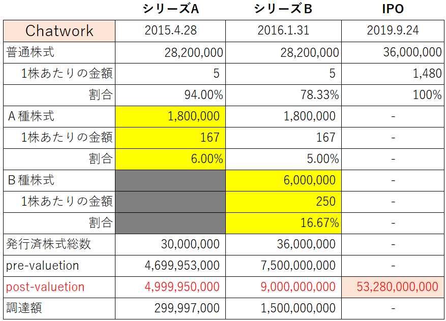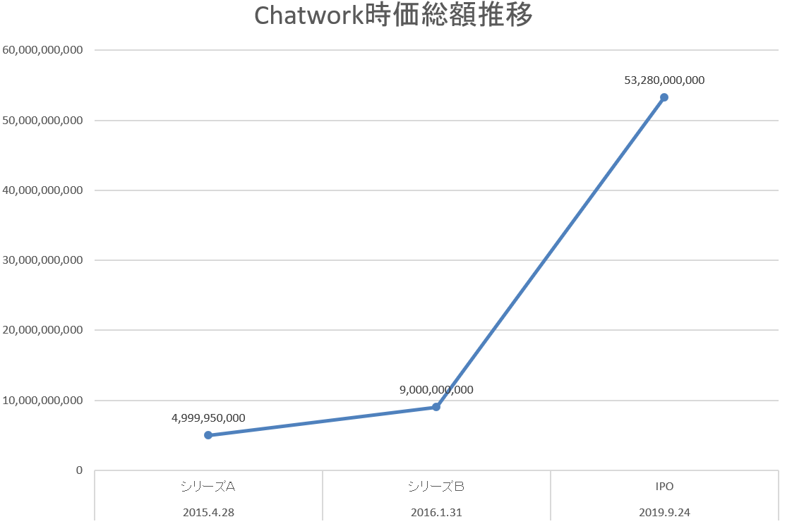 初めて外部資本を入れたシリーズAの時点でChatwork自体はかなり有名なツールであった影響か、いきなりpost-valuetion50億円です。