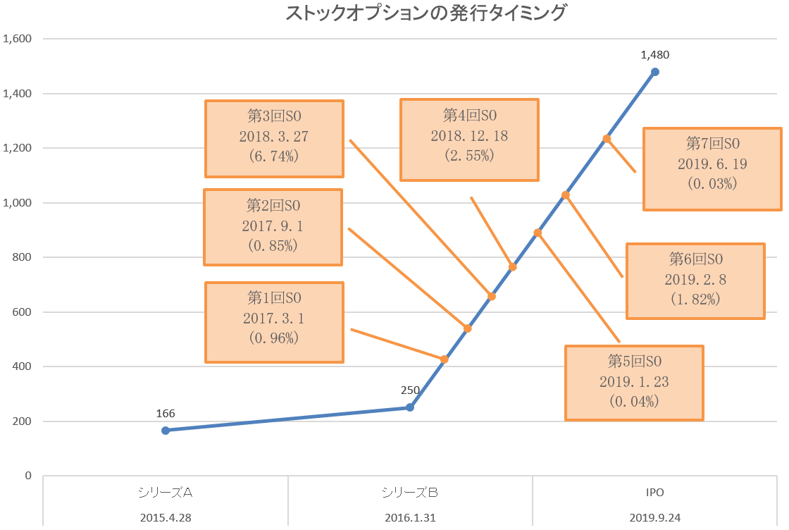 IPOを目指す会社の場合、シリーズAの前や後にストックオプションを発行していることが多い印象ですが、Chatwork社の場合はシリーズBの後に連続して発行しています。
