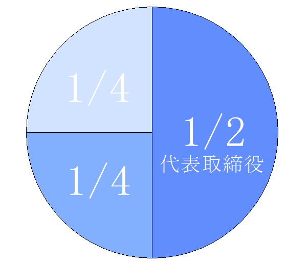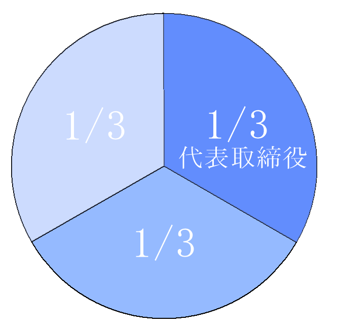 代表取締役が50%、他の2名で50%を持っていた場合も同様です。株主総会の普通決議は過半数(51%)以上の同意が必要なため、こちらはデッドロック状態になってしまいます。